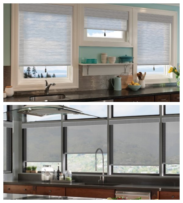 Solar shades are a superb option for the kitchen windows and dining areas. It’s hot enough when you’re cooking that you don’t need the invasive sunlight heating up the room to an even more intense level. Also with the change in seasons, the patterns of the sun change. Some months it may be very pleasant to dine in your kitchen or breakfast nook with the shades up, but when spring and summer roll around, that sun may be just the right height to annoy you and prevent you from enjoying together time with your family. Solar shades cleverly cut down on the harsh light and help to control inside temperatures while still allowing you to observe the view with a minimal, modern window covering.