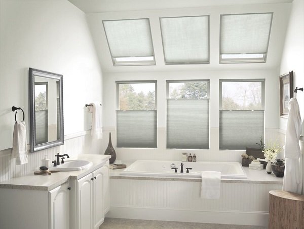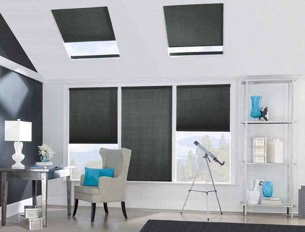 Skylights are prized for bedrooms, bathrooms and entryways where the magnificent height of the room is designed to maximize the light and the view. A minimal window covering is coveted here to showcase the natural light. Blindsgalore has a beautiful selection of Cellular Shades that are made of an insulating material which regulates heat to maintain a more controlled interior temperature by keeping the heat inside during the winter and the heat outside in the summer. Skylight Shades are also helpful with light control. They diffuse direct light when needed, preventing damage from severe UV rays, but can also be opened completely to expose the night sky.