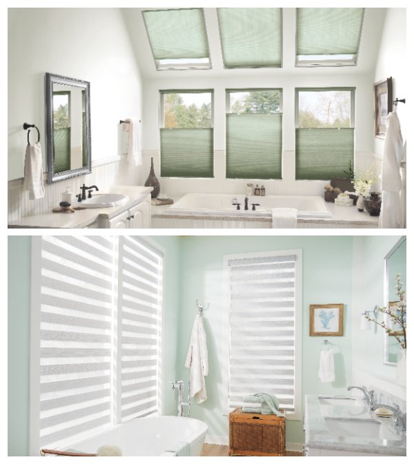Window treatments in the bathroom need to be functional, in addition to being stylish, colorful and uplifting. When designing a bold bathroom, make sure that you have chosen a window treatment that will withstand water and humidity and offer you privacy, yet allow you to take advantage of natural light and fresh air. With these strict conditions, you still have a large chest to dig into to find an outstanding favorite to embolden your bathroom. You will be in good hands with our videos, photos and directions on measuring and installing and our Blindsgalore design experts can guide you along the way to a perfect bathroom window treatment. You do need to be extra choosy when selecting a window treatment for this tricky room, but new window blinds are one of the easiest ways to add drama to any space – no tiresome painting or exacting tile work. Hanging a new custom window treatment can be done by you in a few hours.