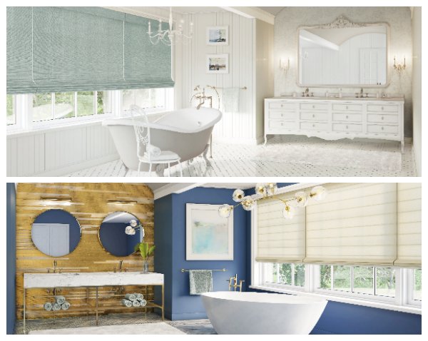 Roman Shades and Roller Shades are your best bet for alluring patterns and interesting designs. Roman Shades easily control light, add softness with a definite designer touch – even an understated elegance to match a modern or a traditional room. Roman Shades can also be motorized for ease when covering a hard to reach place or over the bath or sink area. Roman Shades are an instant upgrade for any bathroom. Just be sure to select a fabric that will resist mildew. Roller Shades, too, come in many colorful shades and bright patterns for a casual, informal but sleek window covering.