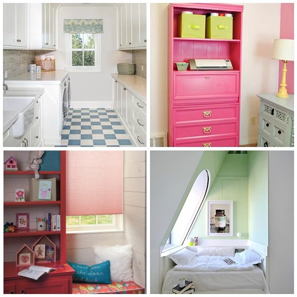 If you are unsure and want to experiment, find an out-of-the-way spot such as a laundry room or a bathroom or an alcove that offers the chance to go a little wild and see what happens. How about a multi-colored checkered floor, big bright clothes baskets or a shocking pink bookcase. Be whimsical and brave when no one else but you, the dog, the heroine in your novel or the dirty laundry are looking (maybe laughing, too)!