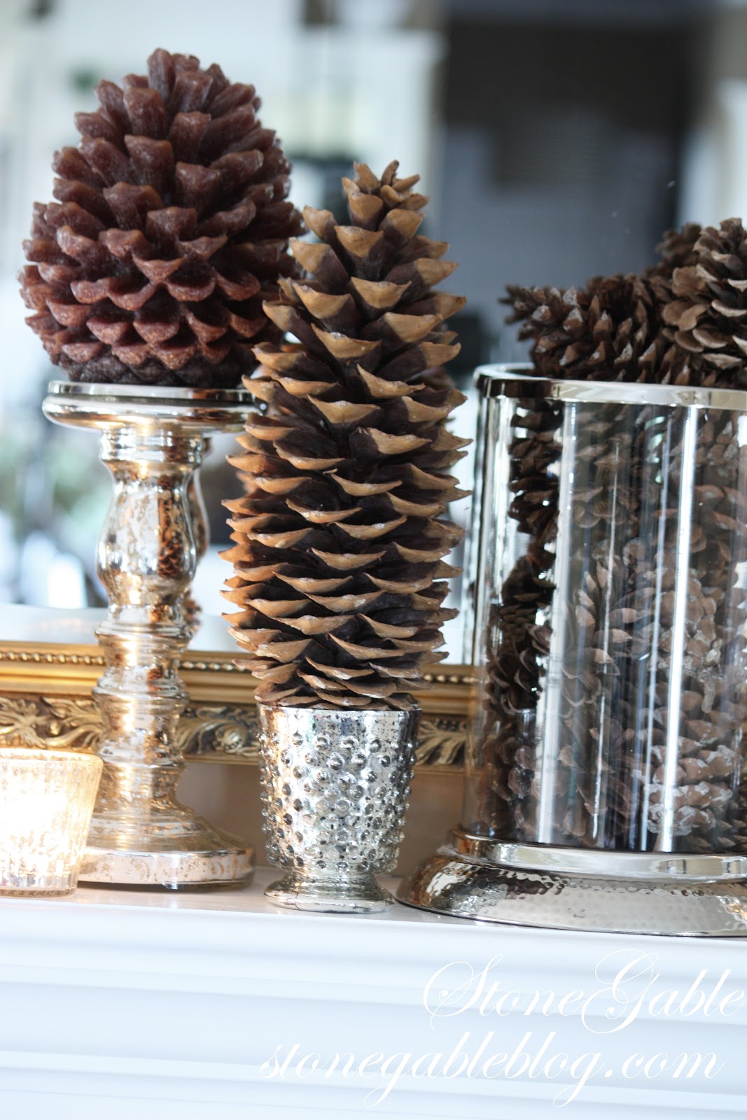 Assemble a group of candlesticks in varying heights and surprise your guests by replacing ordinary candles with silvery painted tiny pine cones, tucked into the candle holders, accented with bits of boxwood from your garden or a few sprigs of herbs for an “au naturel” tableaux that is elegant but simple.