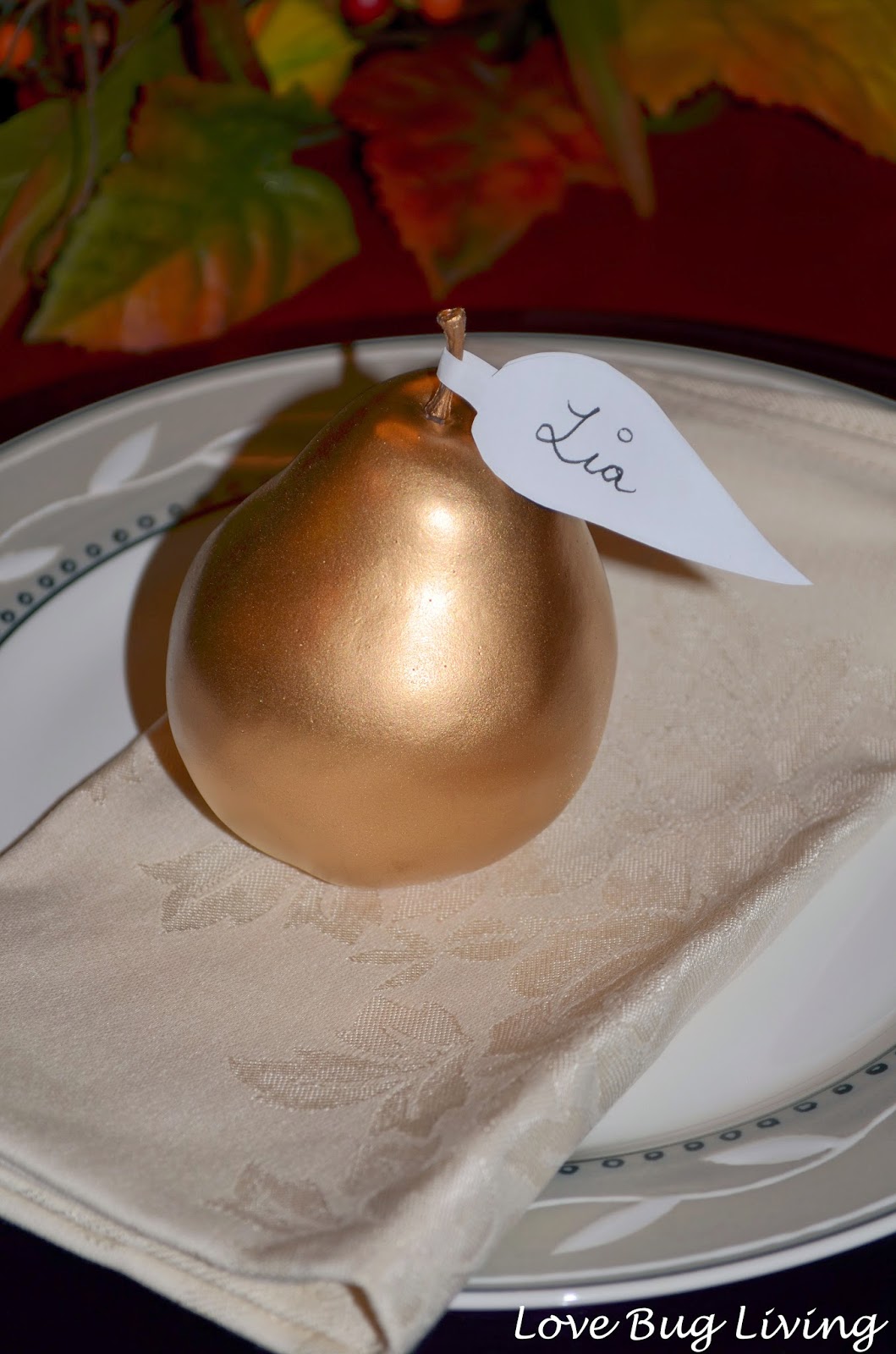 Bosc pears have a sculptural organic shape that are just made for tagging a handwritten place card. Use the pears plain or never fear the gold spray paint can to add a “pear-fect” glitz for all your dinner place settings.