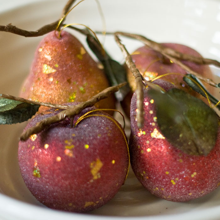 I love using fresh fruit that will withstand these 12 decorating days before Santa comes. Pomegranates, lemons, limes and itty bitty clementines and hard mini pears work well. Either dip in egg white or apply a spray adhesive and roll in coarse sugar crystals or a mixture of 3 parts white glitter to one part silver glitter. Dry thoroughly and arrange artfully in pretty glass bowl. The sparkling coating acts like a preservative and this stunning crystalline centerpiece will grace all your holiday celebrations until the last present is opened.