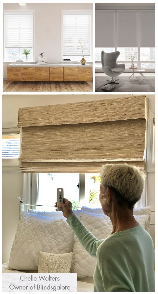 Anytime I get the chance to recommend a short-cut to make home living effortless, I cheer for motorized blinds. With a flick of a button on a remote device, your blinds quickly and easily can be raised or lowered with no dangling cords or getting on a stool or reaching over a bed to struggle with your window coverings. Day and night comfort is quickly adjusted to your needs. Yes, motorized blinds are a luxury but offer complete safety around small children or pets and create an easy solution for hard to reach windows, skylights and outdoor mounted shades. You can even harness the sun to power Solar Shades. My bedroom Solar Shades that cover a double set of patio doors, seamlessly lower at night to darken my room and raise up at the first light of dawn.