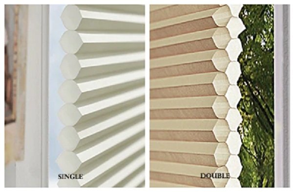Cellular shades are constructed of two layers of pleated fabric bonded together intermittently to form air pockets, also called cells. These air pockets trap either hot or cool air, creating a barrier to the varying temperatures coming through your window glass. Single cell cellular shades have only one layer of cells, while doubles have two. The more cells contained in the shade, the higher the insulating properties as more air is trapped in between the window and your home.
